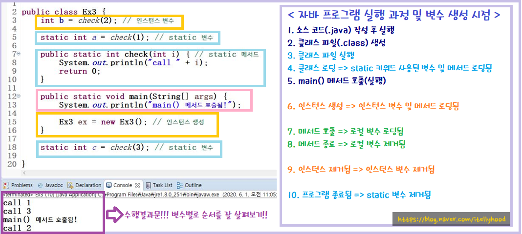 < 자바 프로그램 실행 과정 및 변수 생성 시점 >