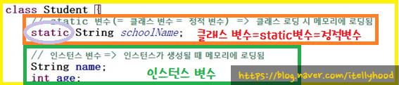 1) 인스턴스 생성 없이 클래스가 메모리에 로딩될 때 변수도 함께 로딩된다